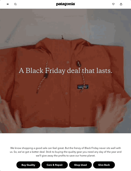 Taking a moment to remind Patagonia customers what the brand stands for gives evergreen messaging a chance to break through. “The frenzy of Black Friday never sits well with us,” they tell their shoppers. Instead, they ask shoppers to buy what they need, when they need it, and to support their mission of giving profits back to the earth.